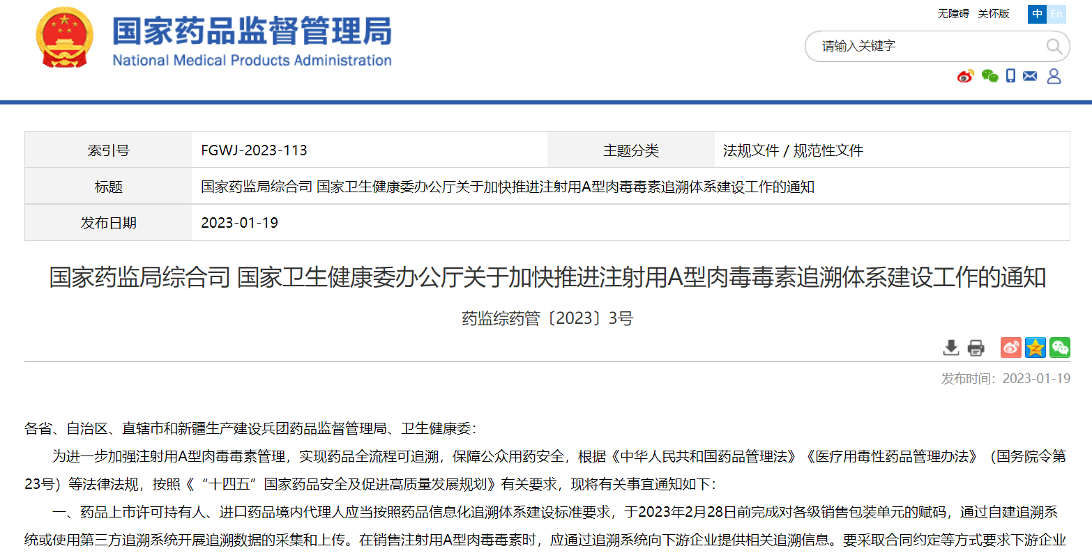 國家藥監局綜合司 國家衛生健康委辦公廳關于加快推進注射用A型肉毒毒素追溯體系建設工作的通知