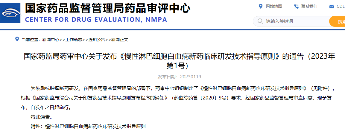 國家藥監局藥審中心關于發布《慢性淋巴細胞白血病新藥臨床研發技術指導原則》的通告(2023年第1號)
