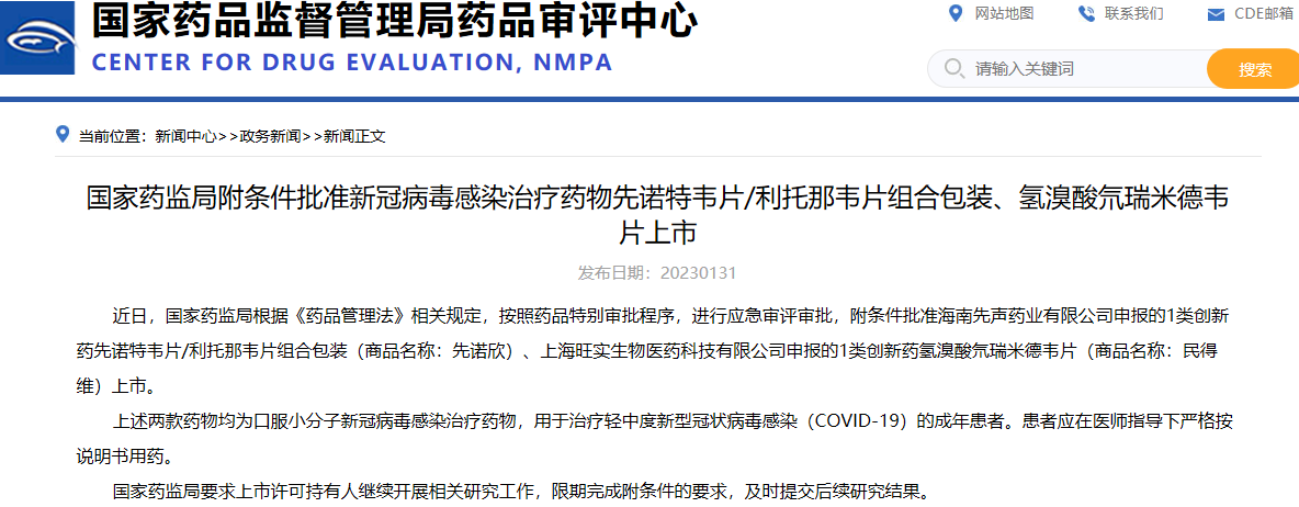 國家藥監局附條件批準新冠病毒感染治療藥物先諾特韋片/利托那韋片組合包裝、氫溴酸氘瑞米德韋片上市