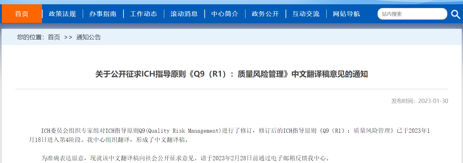 關于公開征求ICH指導原則《Q9(R1):質量風險管理》中文翻譯稿意見的通知