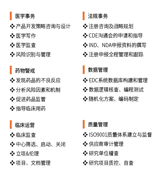 旗下?lián)碛?00余人的專業(yè)臨床服務(wù)團(tuán)隊,下設(shè)醫(yī)學(xué)部、臨床運營部、數(shù)據(jù)部、藥物警戒部、質(zhì)量控制委員會、藥政部、項目管理部、上會管理中心等部門,項目全面覆蓋生物藥、化藥、中藥、醫(yī)療器械、細(xì)胞與基因治療等藥物、滿足不同研發(fā)型企業(yè)的臨床研究定制需求,為國內(nèi)外客戶打通新藥上市前關(guān)鍵瓶頸。