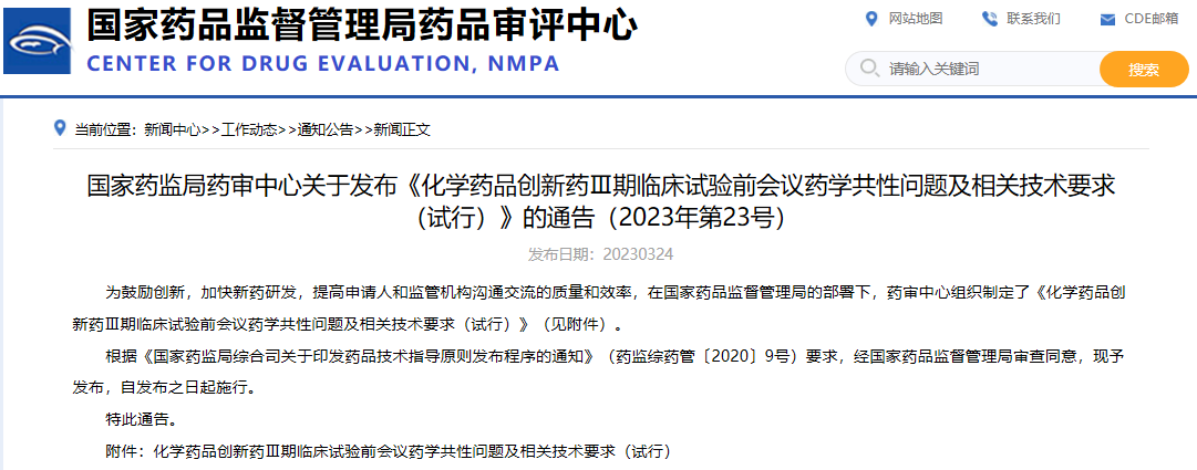 國家藥監局藥審中心關于發布《化學藥品創新藥Ⅲ期臨床試驗前會議藥學共性問題及相關技術要求(試行)》的通告(2023年第23號)