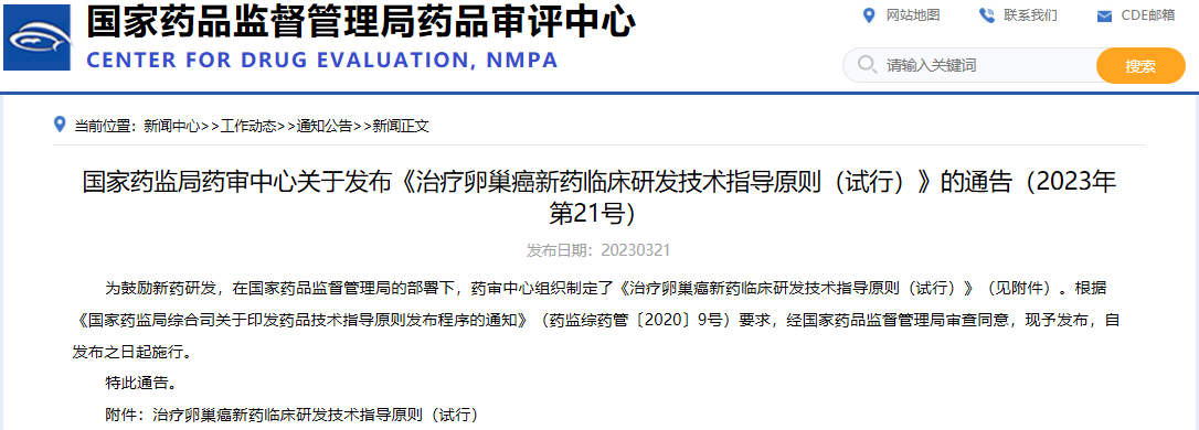 國家藥監局藥審中心關于發布《治療卵巢癌新藥臨床研發技術指導原則(試行)》的通告(2023年第21號)