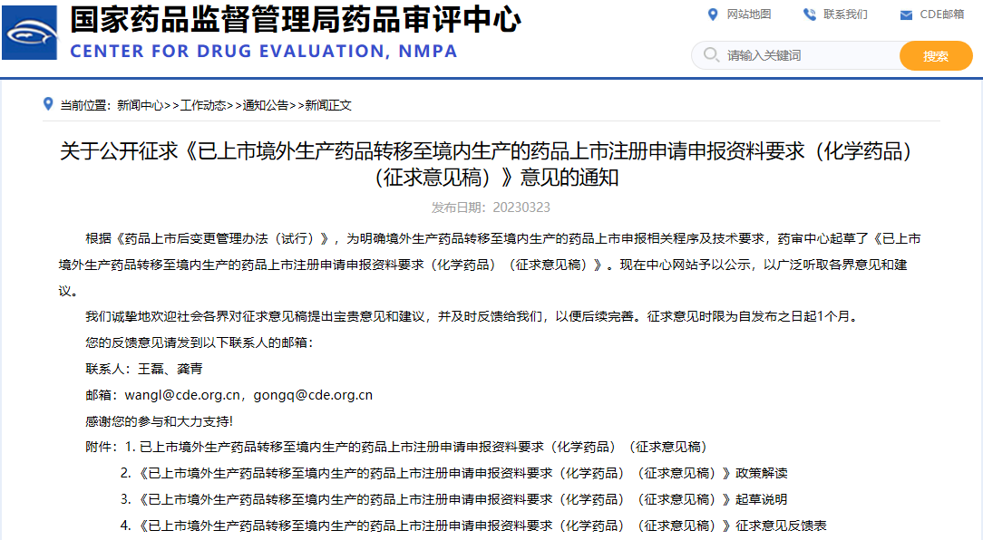 關于公開征求《已上市境外生產藥品轉移至境內生產的藥品上市注冊申請申報資料要求(化學藥品)(征求意見稿)》意見的通知