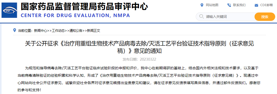 關于公開征求《治療用重組生物技術產品病毒去除/滅活工藝平臺驗證技術指導原則(征求意見稿)》意見的通知