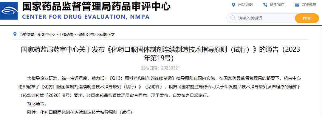 國家藥監局藥審中心關于發布《化藥口服固體制劑連續制造技術指導原則(試行)》的通告(2023年第19號)