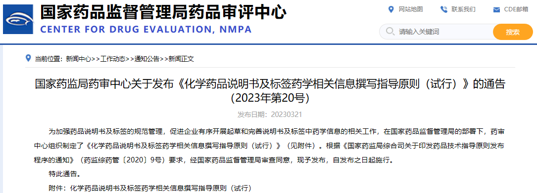 國家藥監局藥審中心關于發布《化學藥品說明書及標簽藥學相關信息撰寫指導原則(試行)》的通告(2023年第20號)