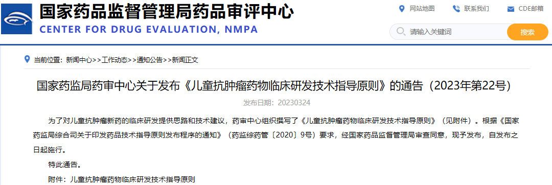 國家藥監局藥審中心關于發布《兒童抗腫瘤藥物臨床研發技術指導原則》的通告(2023年第22號)