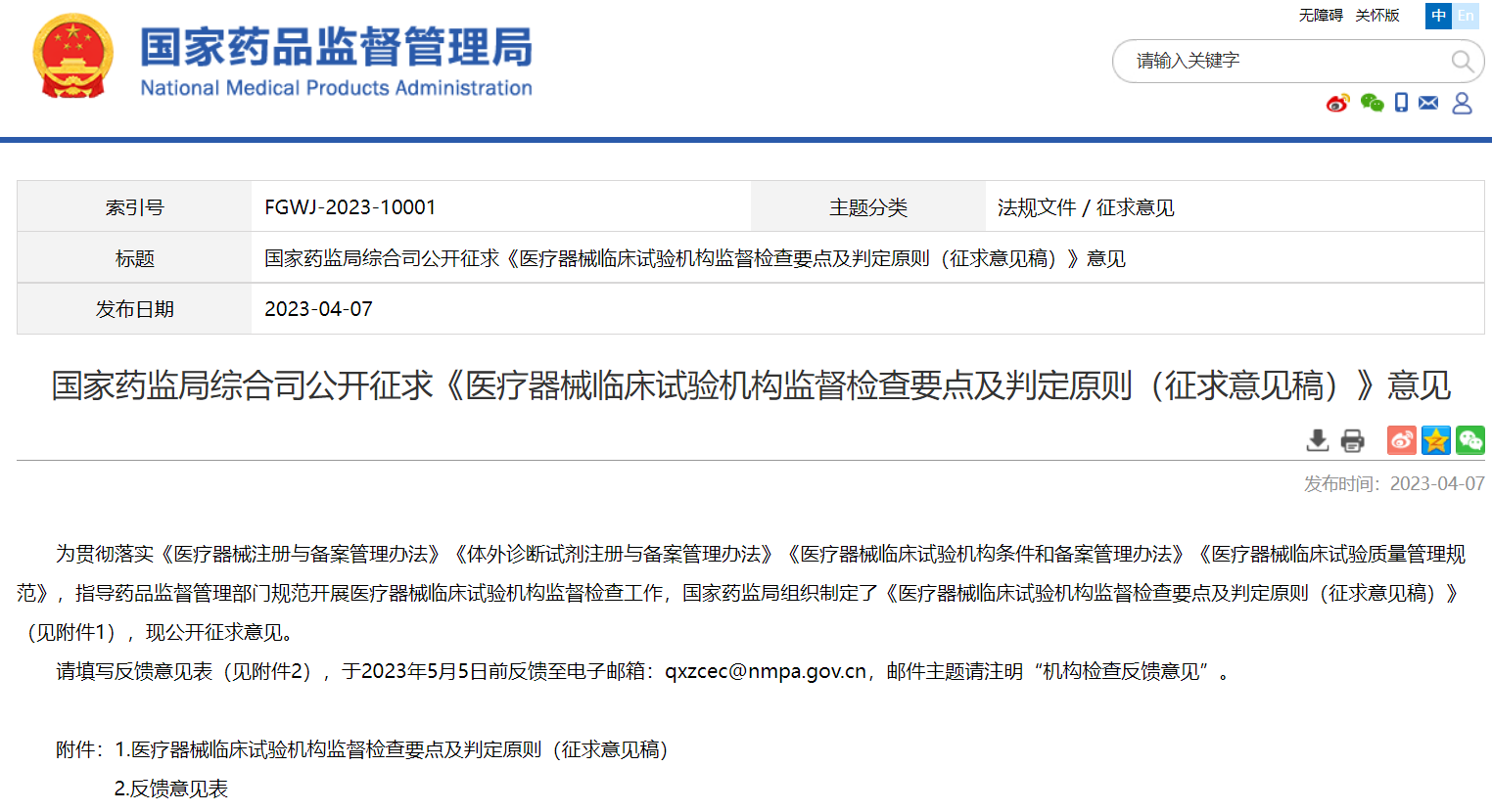 國家藥監(jiān)局綜合司公開征求《醫(yī)療器械臨床試驗機構(gòu)監(jiān)督檢查要點及判定原則(征求意見稿)》意見