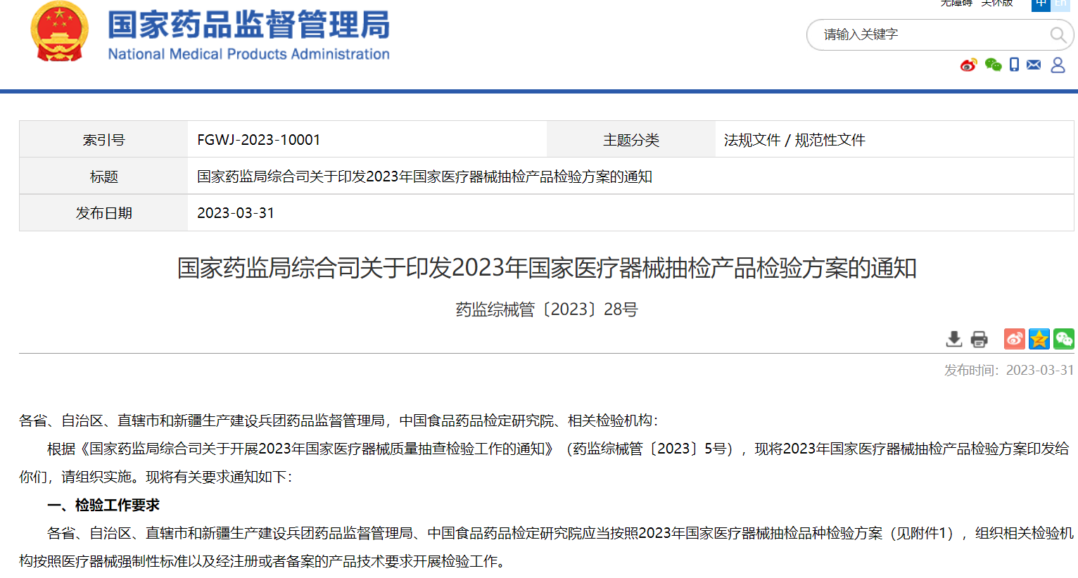 國家藥監(jiān)局綜合司關(guān)于印發(fā)2023年國家醫(yī)療器械抽檢產(chǎn)品檢驗方案的通知