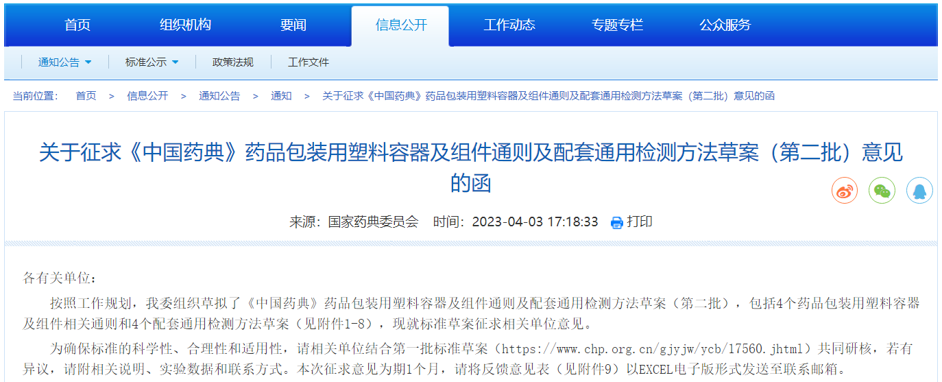 關(guān)于征求《中國藥典》藥品包裝用塑料容器及組件通則及配套通用檢測方法草案(第二批)意見的函