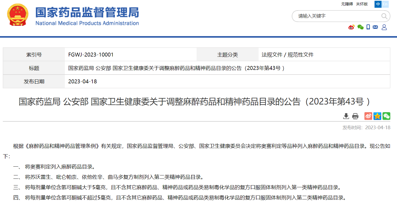 國家藥監局 公安部 國家衛生健康委關于調整麻醉藥品和精神藥品目錄的公告(2023年第43號 )