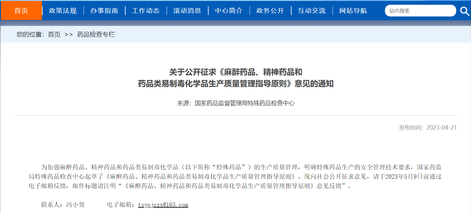 關于公開征求《麻醉藥品、精神藥品和藥品類易制毒化學品生產質量管理指導原則》意見的通知