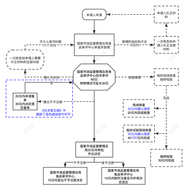 注冊前需提前食品審評機構溝通交流,經溝通確認后方可在提出注冊申請時,同時提出優先審評審批申請。符合條件的,經公示后納入優先審評審批程序。注冊申請的審評時限縮短到30個工作日,審評機構將優先安排現場核查、抽樣檢驗,經溝通交流確認后,可以補充提交技術材料。