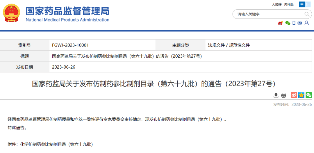 國家藥監(jiān)局關于發(fā)布仿制藥參比制劑目錄(第六十九批)的通告(2023年第27號)