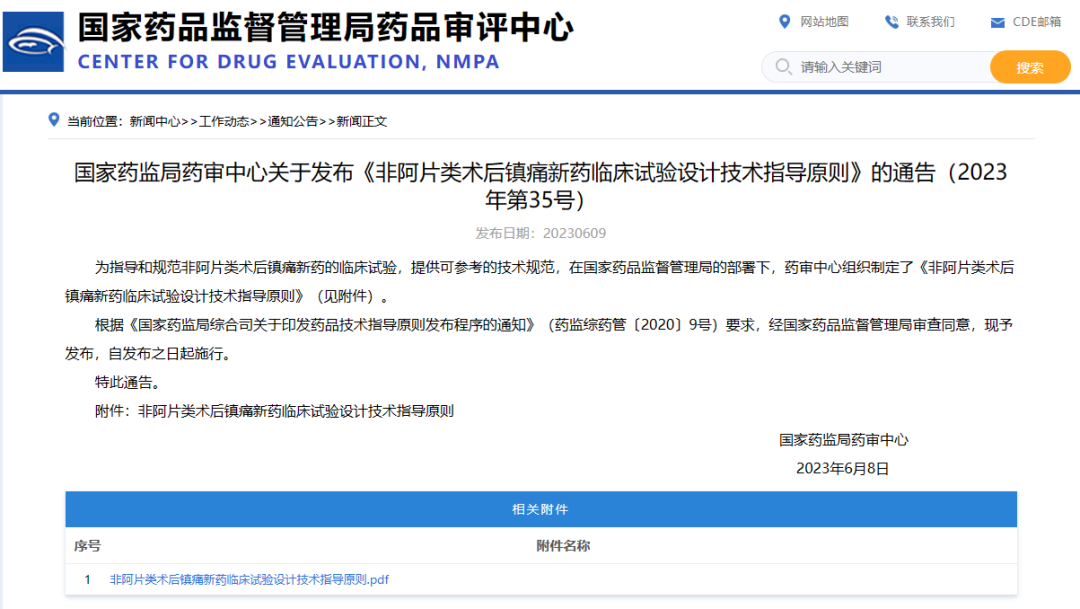 國家藥監(jiān)局藥審中心關于發(fā)布《非阿片類術后鎮(zhèn)痛新藥臨床試驗設計技術指導原則》的通告(2023年第35號)