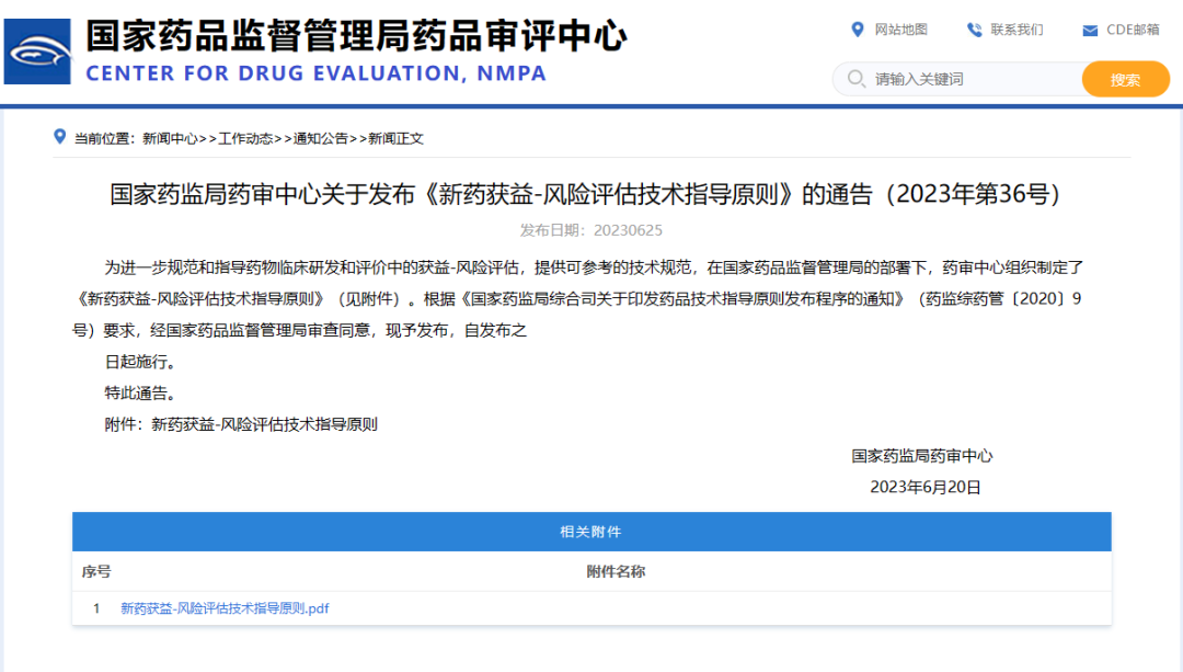 國家藥監(jiān)局藥審中心關于發(fā)布《新藥獲益-風險評估技術指導原則》的通告(2023年第36號)