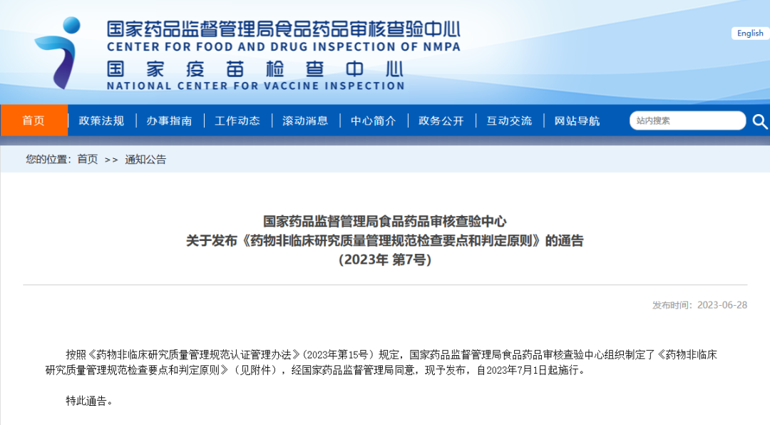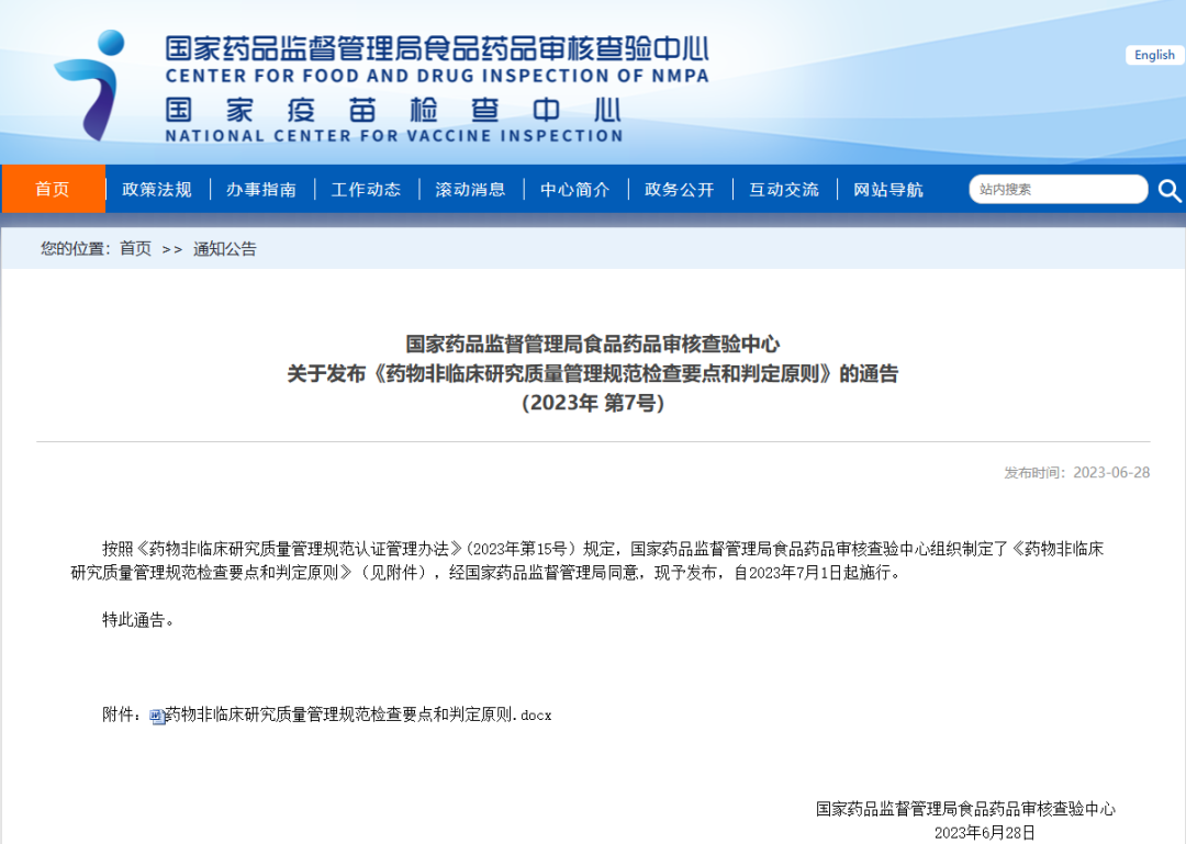 國家藥品監(jiān)督管理局食品藥品審核查驗中心關于發(fā)布《藥物非臨床研究質量管理規(guī)范檢查要點和判定原則》的通告(2023年 第7號)