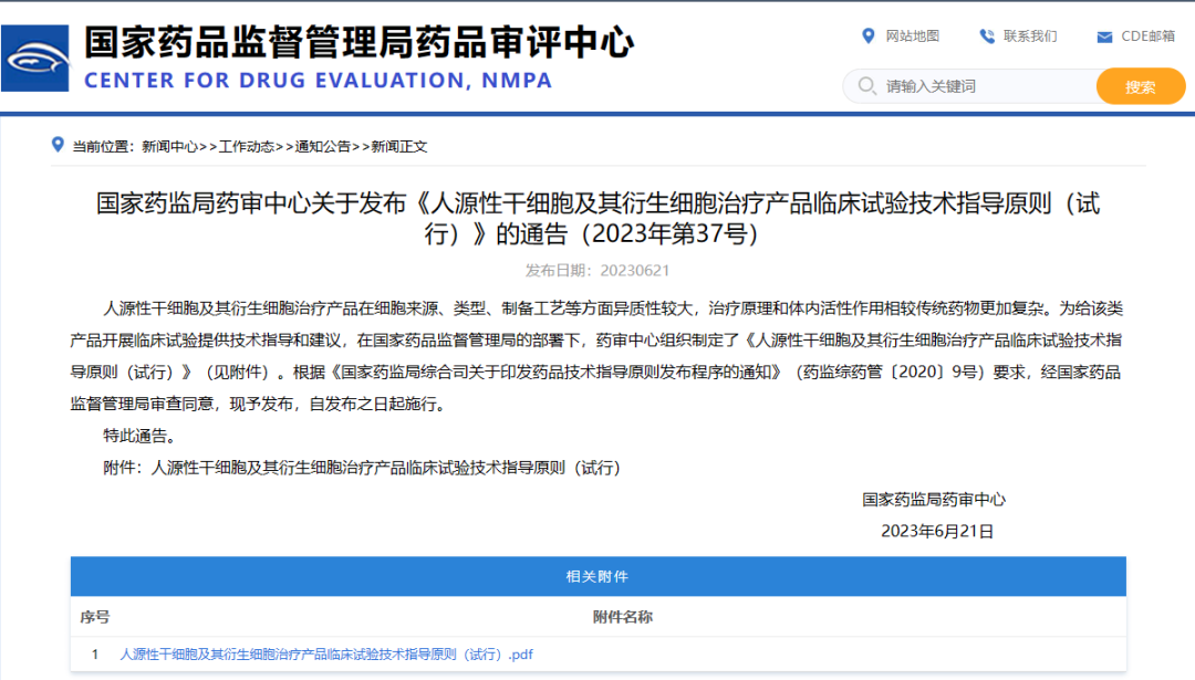 國家藥監(jiān)局藥審中心關于發(fā)布《人源性干細胞及其衍生細胞治療產(chǎn)品臨床試驗技術指導原則(試行)》的通告(2023年第37號)