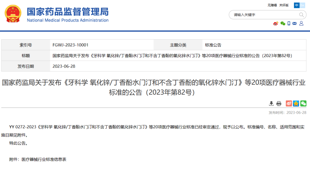 國家藥監(jiān)局關于發(fā)布《牙科學 氧化鋅/丁香酚水門汀和不含丁香酚的氧化鋅水門汀》等20項醫(yī)療器械行業(yè)標準的公告(2023年第82號)