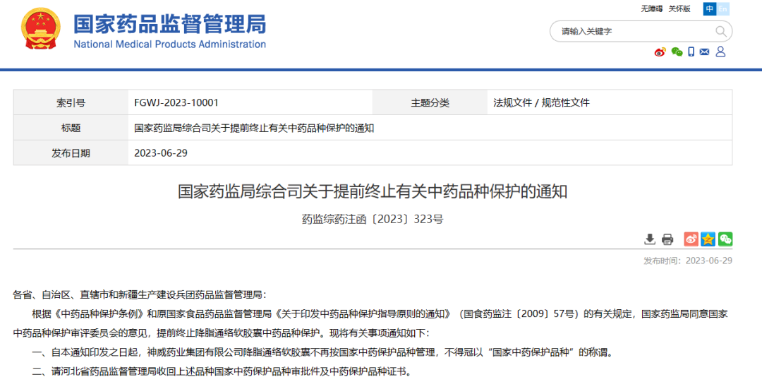 國家藥監(jiān)局綜合司關于提前終止有關中藥品種保護的通知