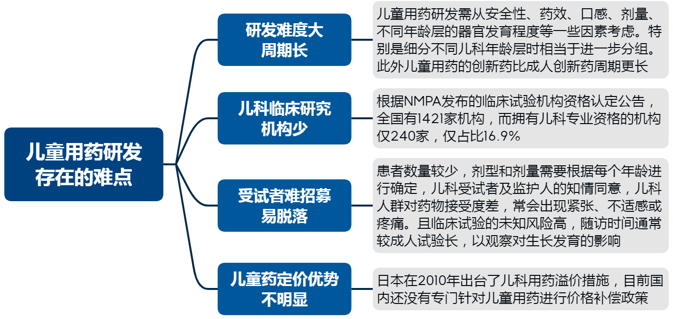 兒童用藥呈現“四少三高”的局面:品種少、劑型少、規格少、特藥少,用藥風險高、不良反應高、資源浪費高。造成這個現狀的原因一是研發難度大、研發周期長;二是兒童專業研發機構比較少;三是試驗受試者難招募、易脫落;四是定價優勢不明顯,市場推廣難度大。目前國家已經推出相應政策和指導原則(如技術端:對兒童專用藥,自該適應癥首次在中國獲批之日起給予6年數據保護期以及12個月市場獨占期;審評審批端:兒童藥優先審評審批并明確為第一優先級別;市場端:放寬醫療機構兒童藥品“一品兩規”限制、優先納入國家醫保、國家基本藥物目錄等),以指導和鼓勵企業研發兒童用藥,促進或推動兒童藥物可及,滿足兒童臨床用藥需求。