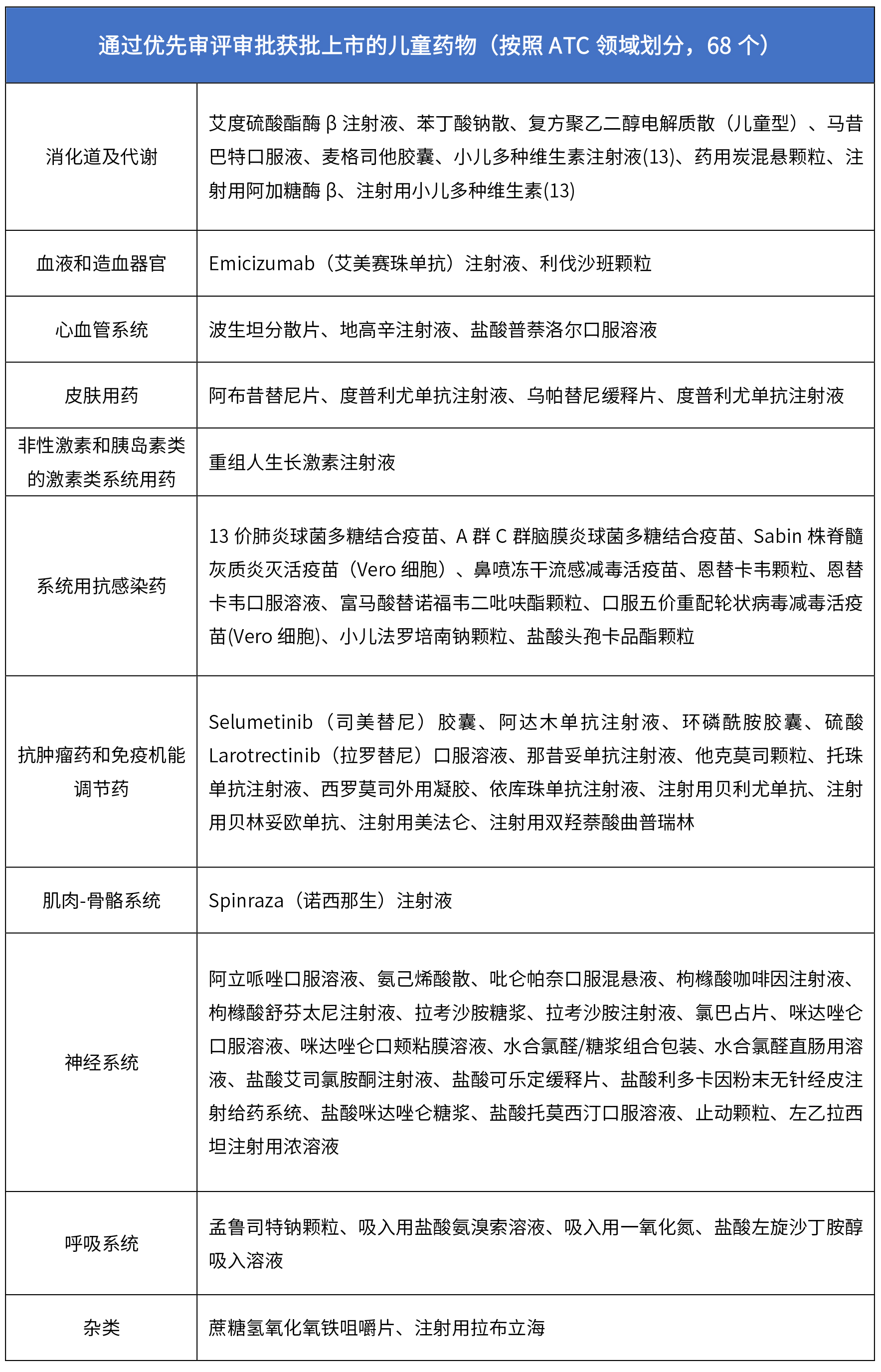 2016-2023年(截至2023.06.27)國家局已陸續將1446個品種納入優先審評程序中,其中兒童藥物199件(占比為13.76%),已有80多個企業享受優惠政策。截至目前,通過兒童用藥優先審評審批上市的產品共計批準上市的重點領域的兒科藥物有氯巴占片、馬昔巴特口服液、吡侖帕奈口服混懸液、地高辛注射液、司美替尼膠囊、復方聚乙二醇電解質散(兒童型)、注射用雙羥萘酸曲普瑞林、蔗糖氫氧化氧鐵咀嚼片、富馬酸替諾福韋二吡呋酯顆粒、那昔妥單抗注射液等。上述藥物的獲批上市,滿足患者需求和解決臨床可及性,同時為兒科患者提供了適合的劑型選擇、便捷的給藥方式。(數據來源insight數據庫、CDE)