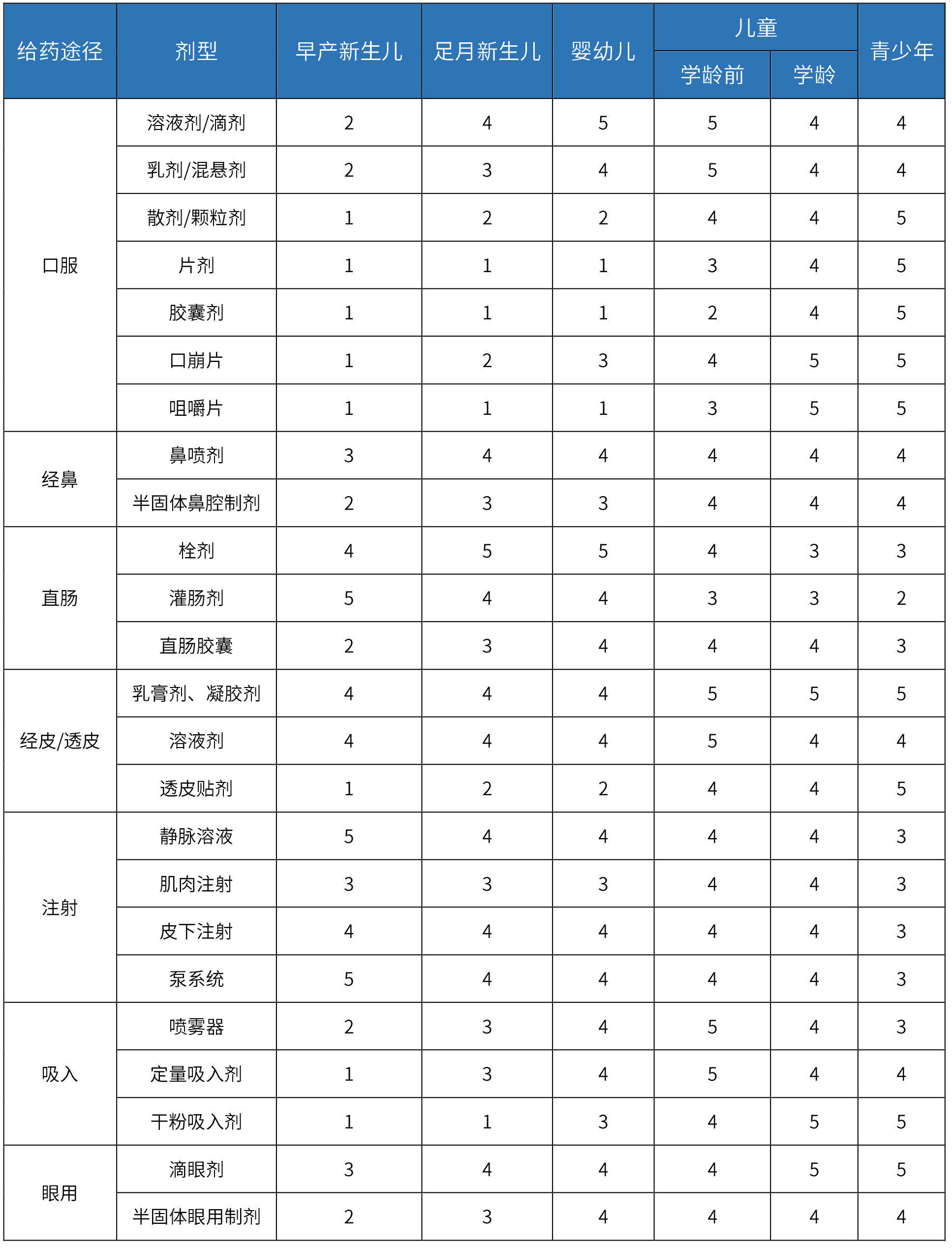 顆粒劑、散劑、口服溶液、口服混懸液、口服滴劑、口服乳劑、細粒劑、口崩片、口溶膜劑、干混懸劑、咀嚼片、微片、片劑、分散片、膠囊、注射劑等。在2020年發布的《兒童用藥(化學藥品)藥學開發指導原則(試行)》中,藥審中心列舉了不同年齡段兒童對于部分給藥途徑和劑型的可接受性調研結果。指標1~5對于低齡兒童主要說明給藥途徑和劑型的適宜性,數值越高,適宜性越高;對于更高年齡的兒童表示對特定劑型的接受程度,數值越高,接受程度越高。