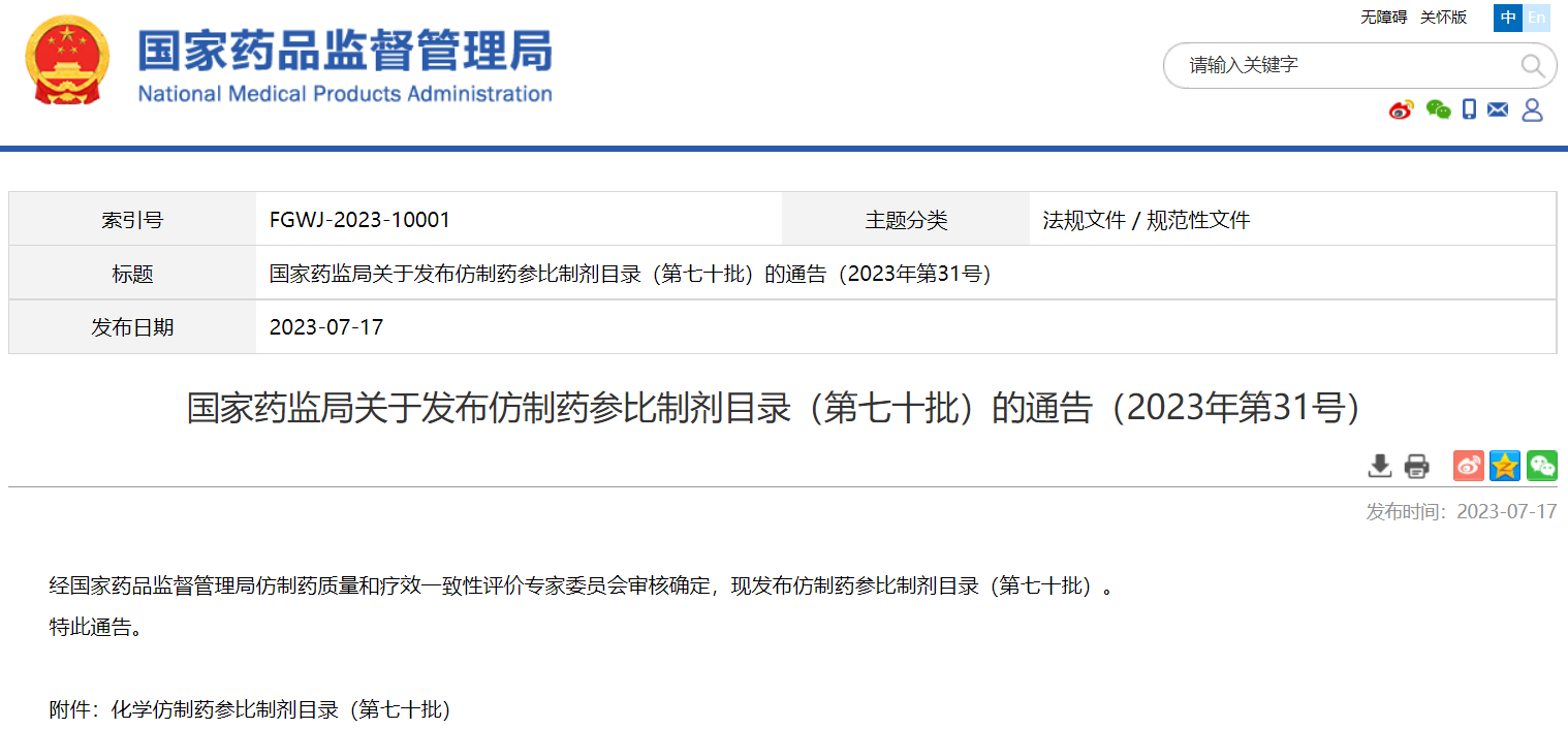 國家藥監局關于發布仿制藥參比制劑目錄(第七十批)的通告(2023年第31號)