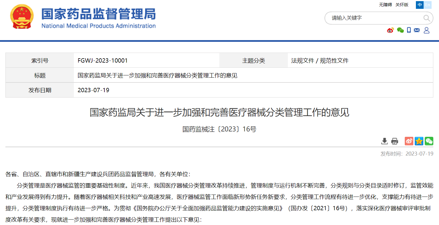 國家藥監局關于進一步加強和完善醫療器械分類管理工作的意見