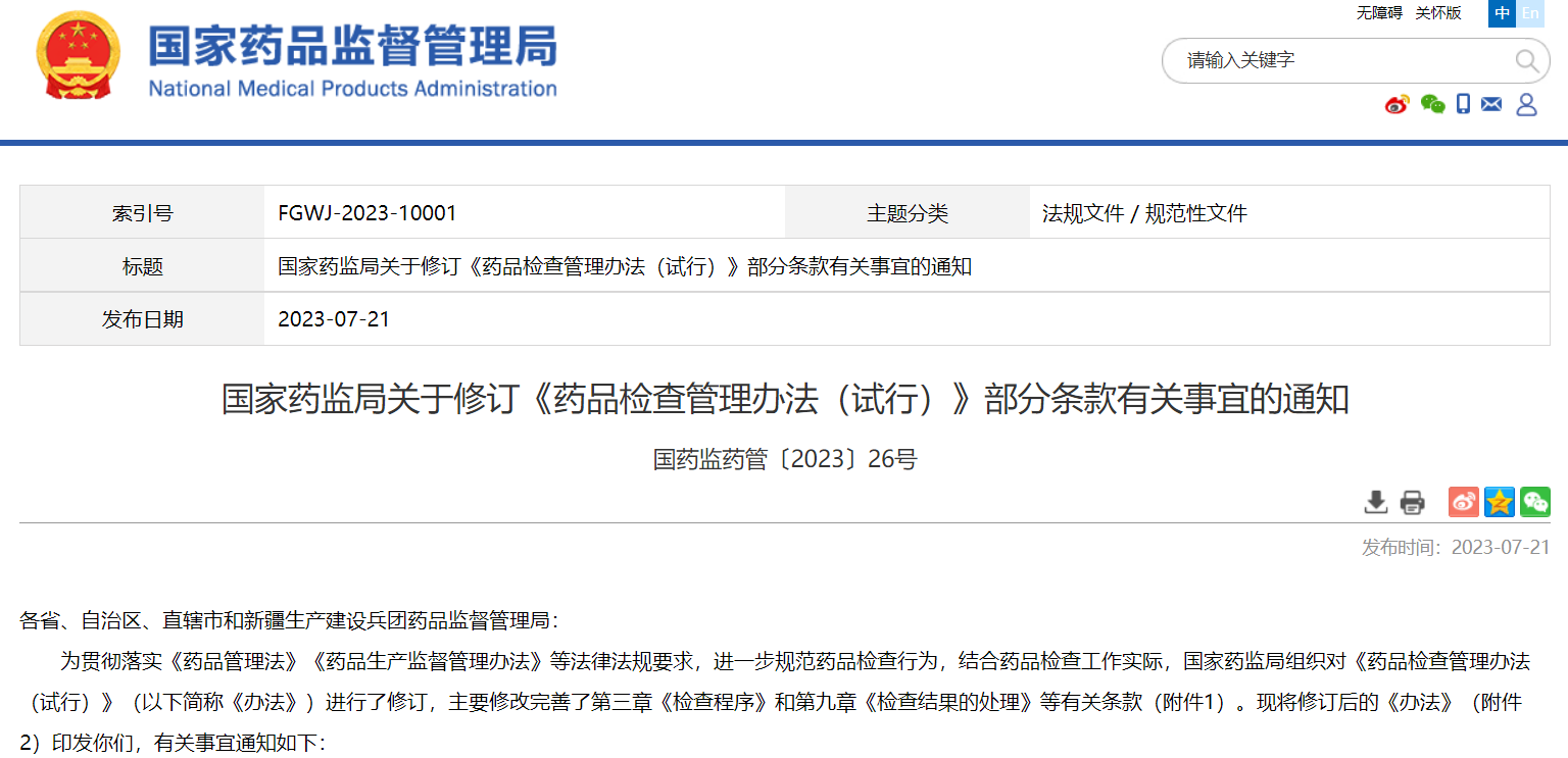 國家藥監局關于修訂《藥品檢查管理辦法(試行)》部分條款有關事宜的通知