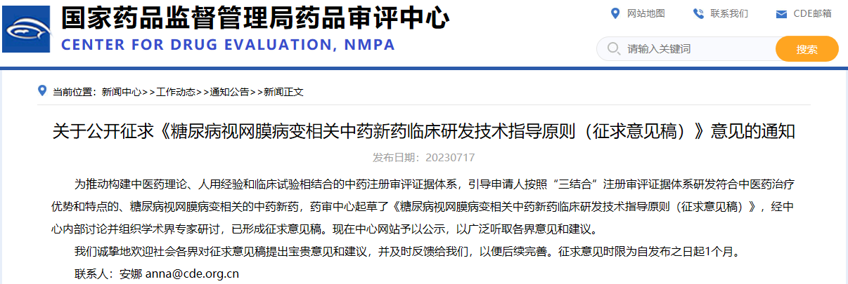 關于公開征求《糖尿病視網膜病變相關中藥新藥臨床研發技術指導原則(征求意見稿)》意見的通知