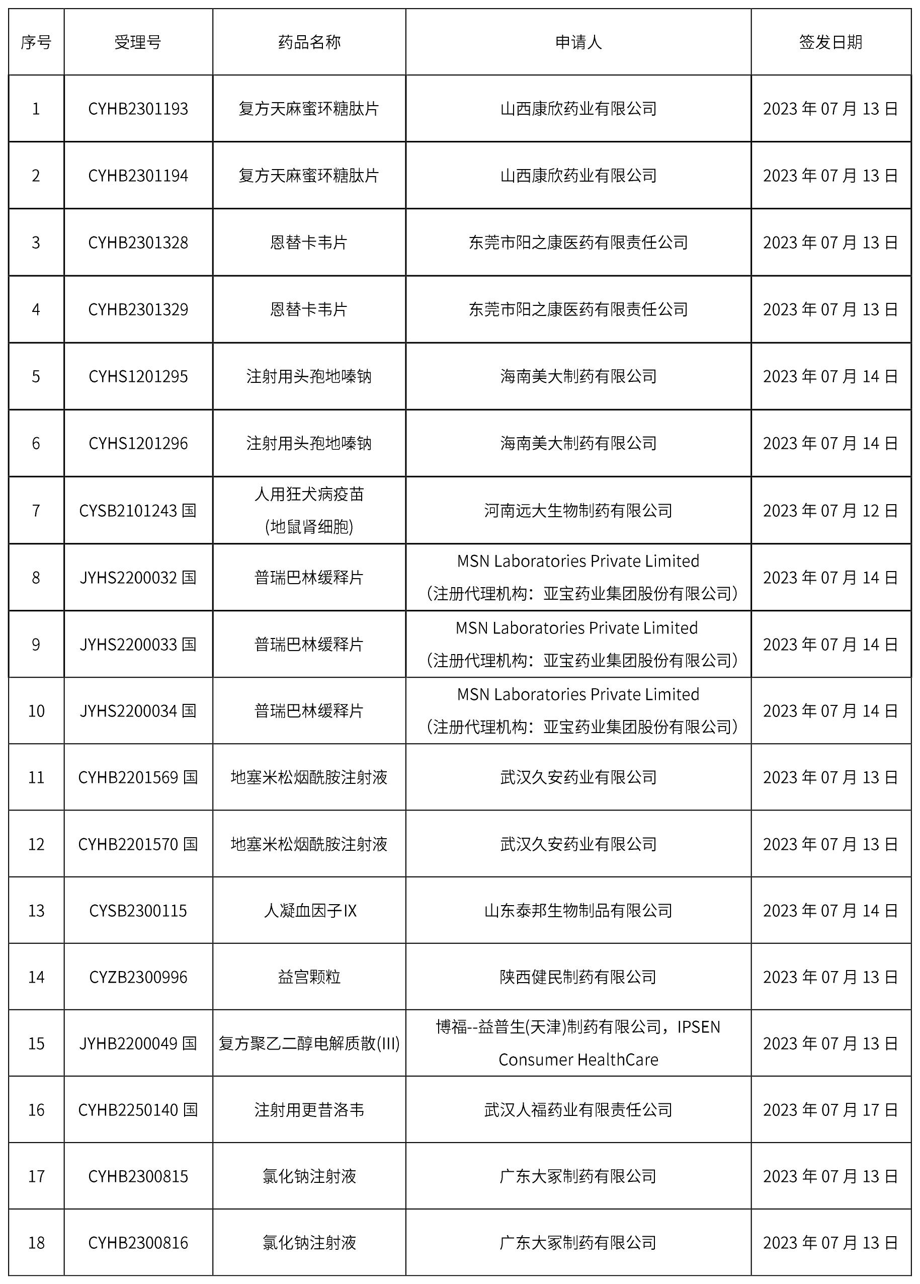 1. 截止2023年7月21日 16:00本周發布18個待領取藥品批準證明文件,其中注射液7個。