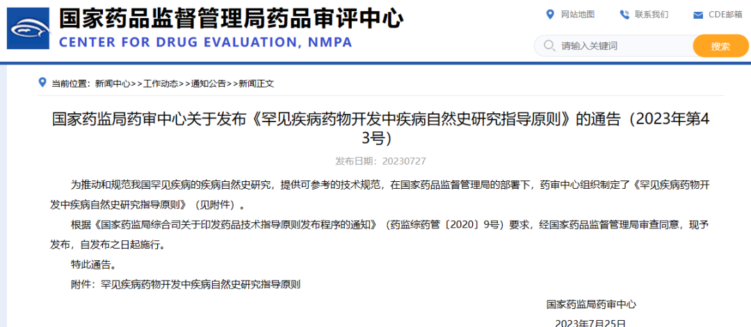 國家藥監局藥審中心關于發布《罕見疾病藥物開發中疾病自然史研究指導原則》的通告(2023年第43號)