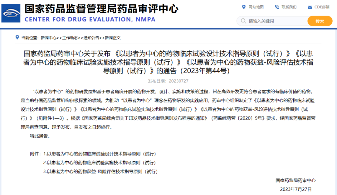 國家藥監局藥審中心關于發布 《以患者為中心的藥物臨床試驗設計技術指導原則(試行)》《以患者為中心的藥物臨床試驗實施技術指導原則(試行)》《以患者為中心的藥物獲益-風險評估技術指導原則(試行)》的通告(2023年第44號)