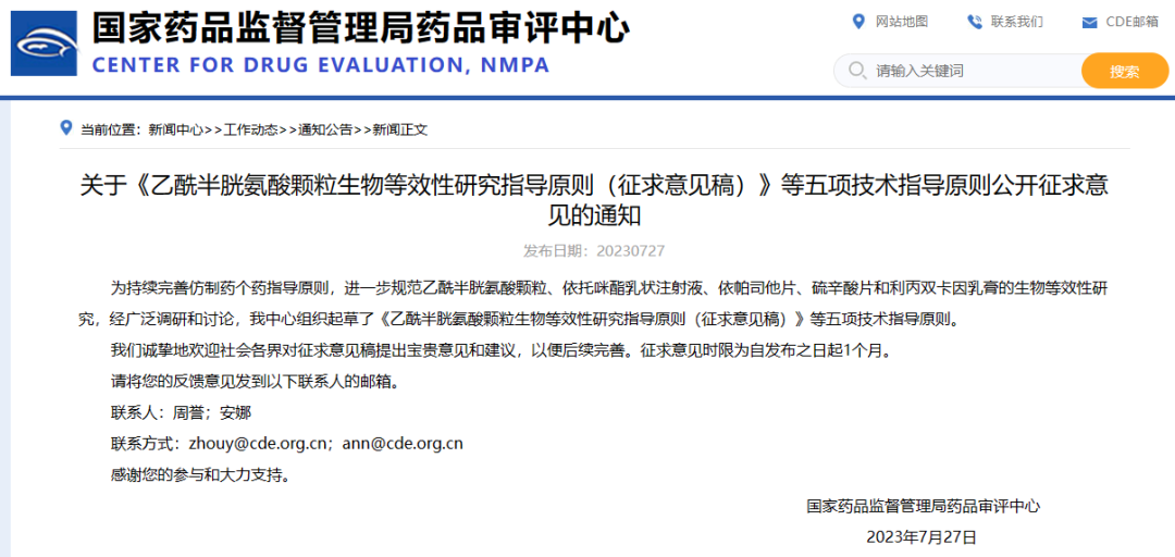 關于《乙酰半胱氨酸顆粒生物等效性研究指導原則(征求意見稿)》等五項技術指導原則公開征求意見的通知