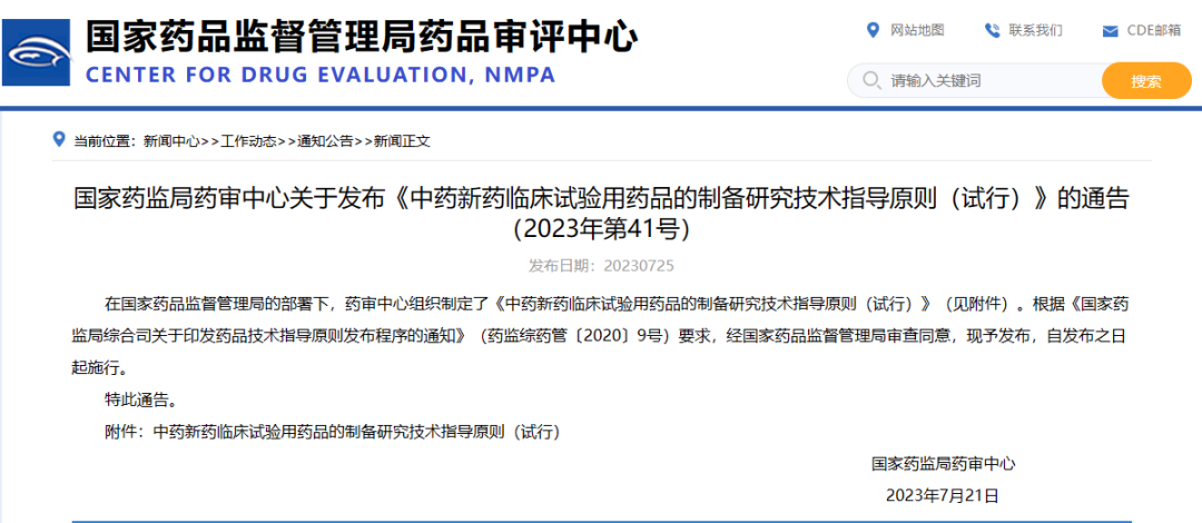 國家藥監局藥審中心關于發布《中藥新藥臨床試驗用藥品的制備研究技術指導原則(試行)》的通告(2023年第41號)