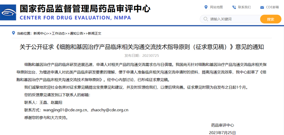 關于公開征求《細胞和基因治療產品臨床相關溝通交流技術指導原則(征求意見稿)》意見的通知