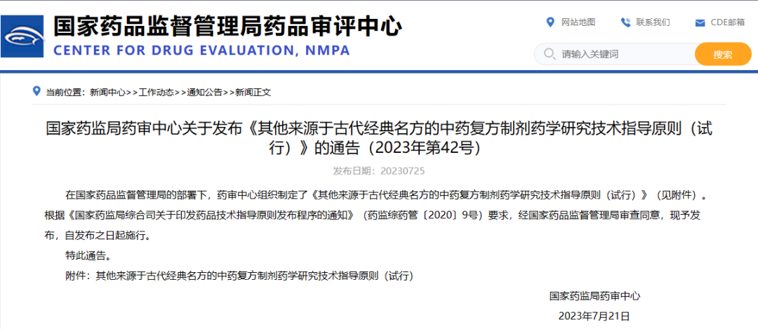 國家藥監局藥審中心關于發布《其他來源于古代經典名方的中藥復方制劑藥學研究技術指導原則(試行)》的通告(2023年第42號)