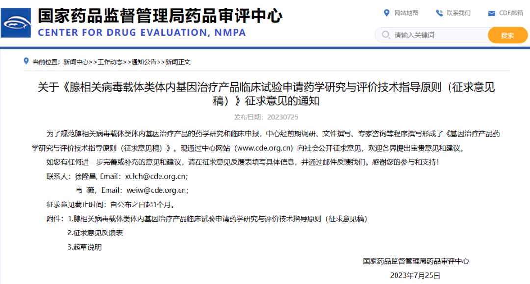 關于《腺相關病毒載體類體內基因治療產品臨床試驗申請藥學研究與評價技術指導原則(征求意見稿)》征求意見的通知