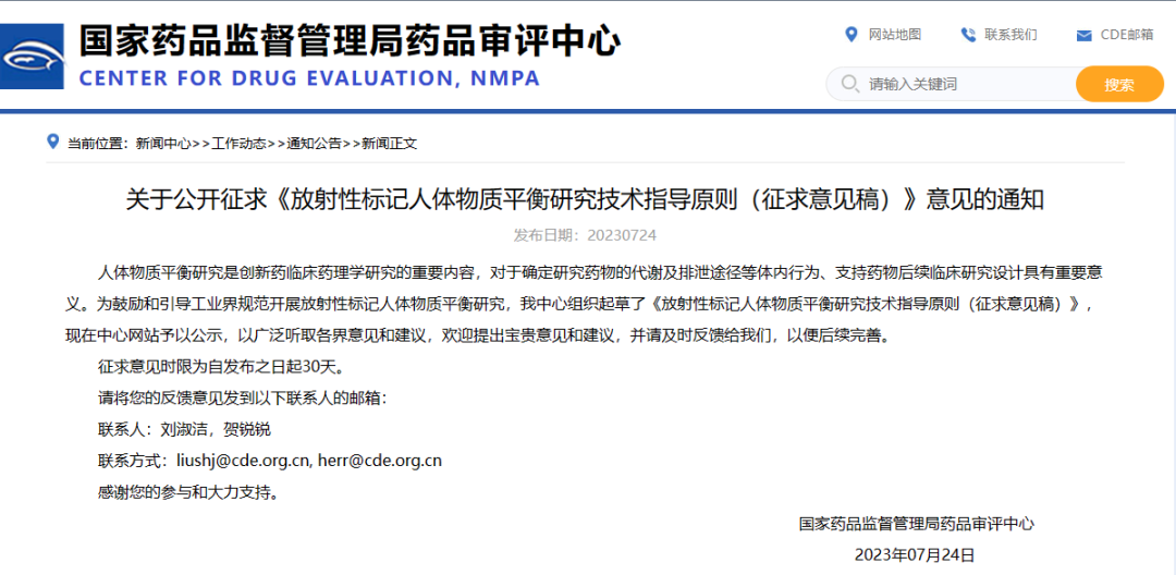 關于公開征求《放射性標記人體物質平衡研究技術指導原則(征求意見稿)》意見的通知