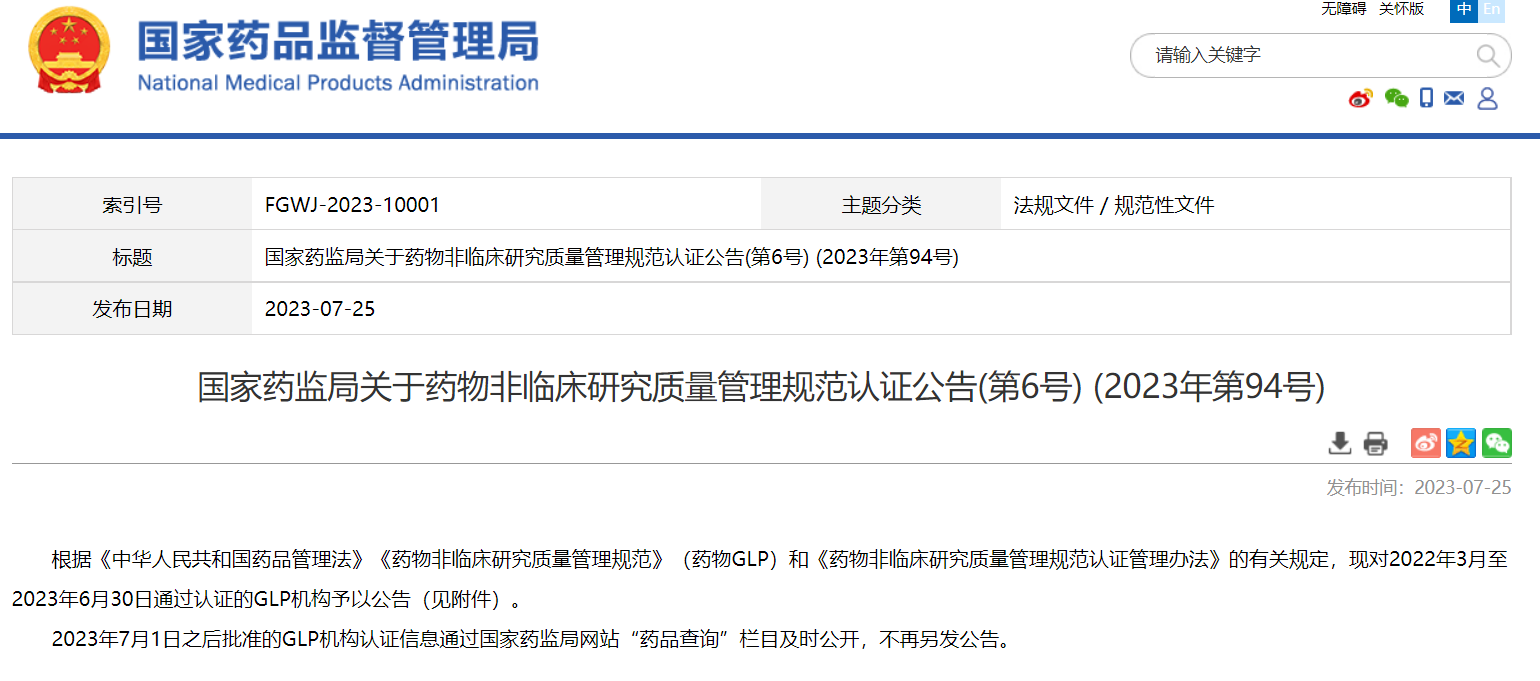 國家藥監局關于藥物非臨床研究質量管理規范認證公告(第6號) (2023年第94號)