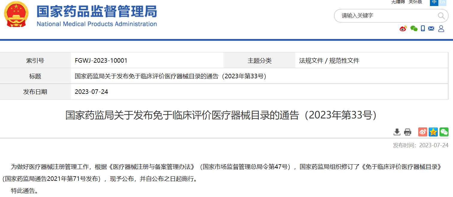 國家藥監局關于發布免于臨床評價醫療器械目錄的通告(2023年第33號)