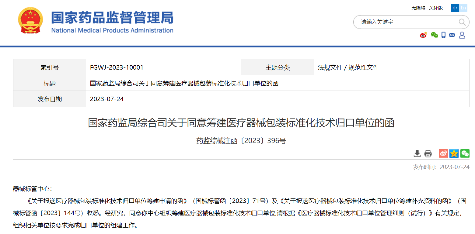 國家藥監局綜合司關于同意籌建醫療器械包裝標準化技術歸口單位的函