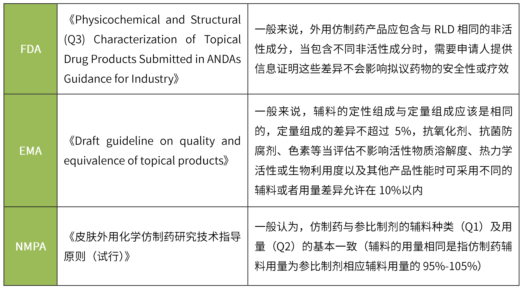 透皮制劑仿制藥一般要求與參比制劑的輔料種類及用量一致,無論FDA、EMA還是NMPA,在對(duì)處方組成的要求上大同小異,均要求輔料種類一致、用量基本相同。