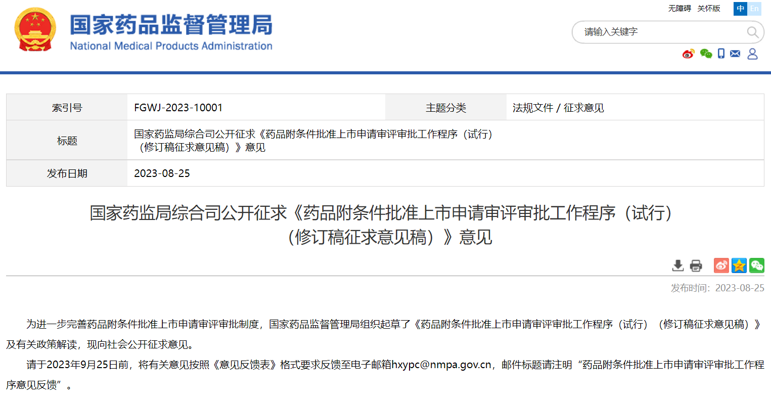 國家藥監局綜合司公開征求《藥品附條件批準上市申請審評審批工作程序(試行)(修訂稿征求意見稿)》意見