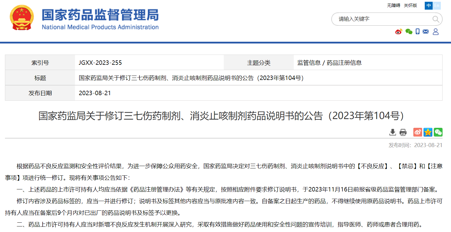 國家藥監局關于修訂三七傷藥制劑、消炎止咳制劑藥品說明書的公告(2023年第104號)