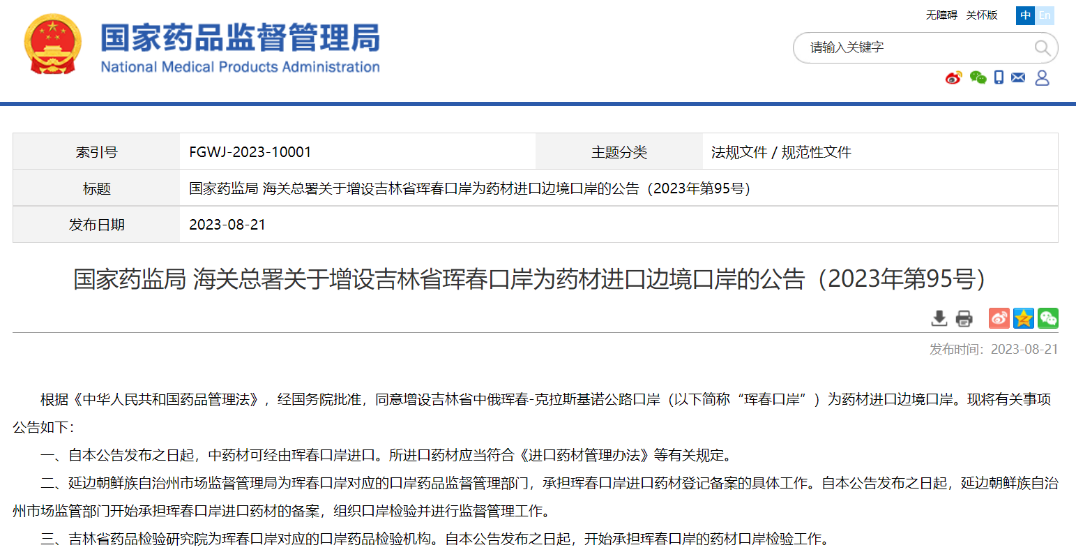 國家藥監局海關總署關于增設吉林省琿春口岸為藥材進口邊境口岸的公告(2023年第95號)