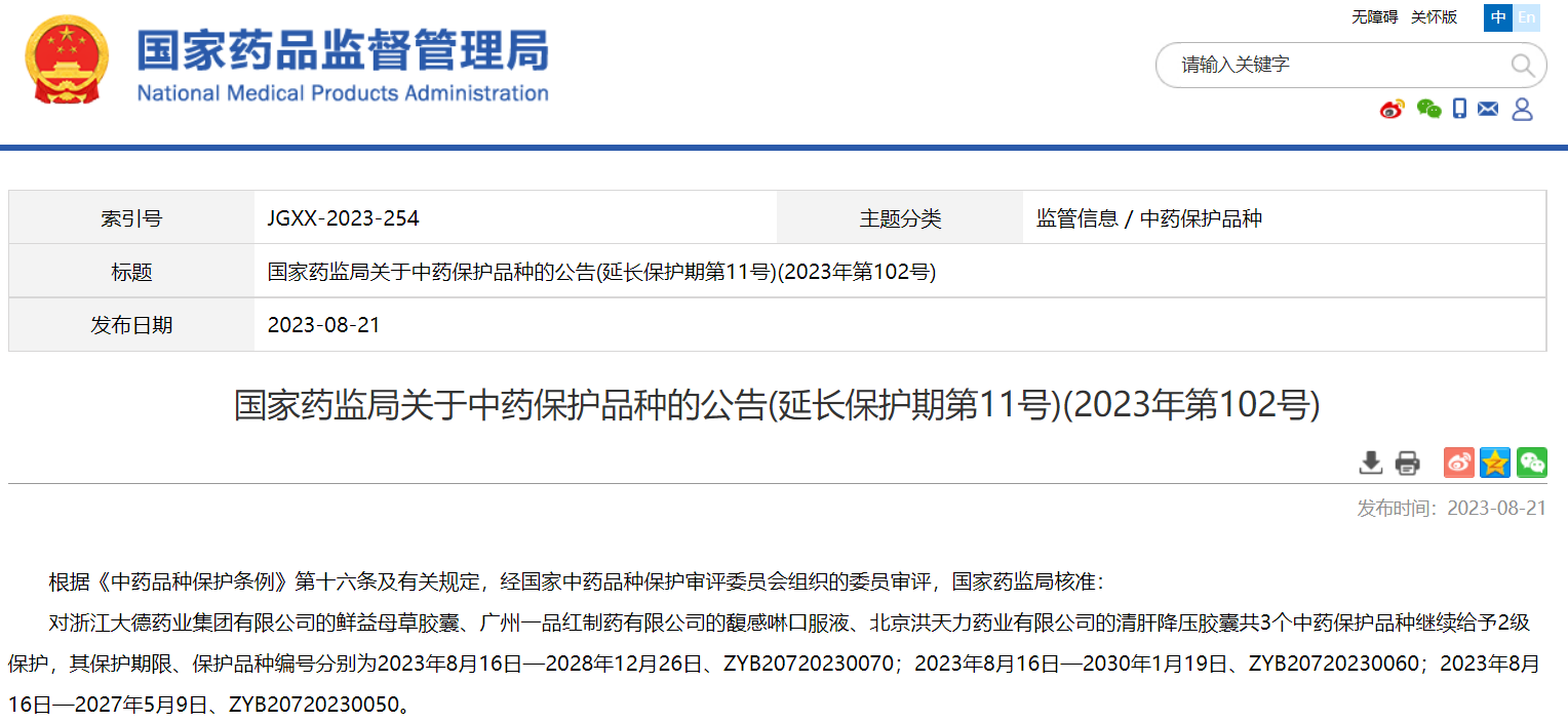 國家藥監局關于中藥保護品種的公告(延長保護期第11號)(2023年第102號)