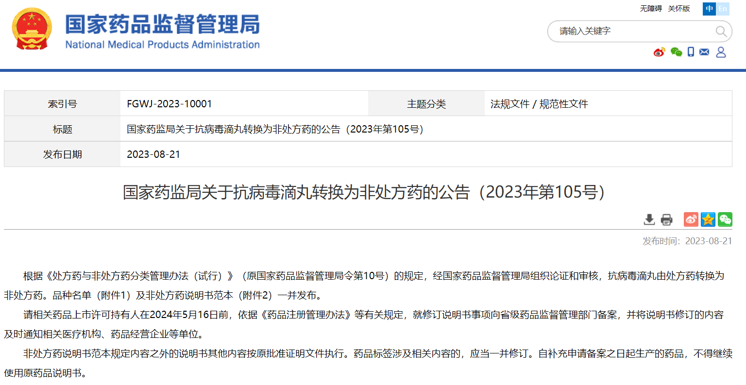 國家藥監局關于抗病毒滴丸轉換為非處方藥的公告(2023年第105號)
